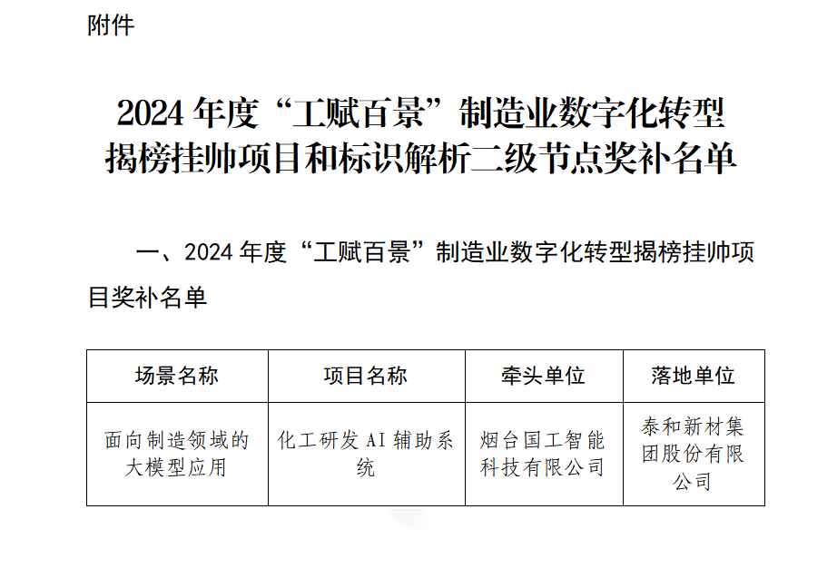 6月3日,省工信廳發(fā)布《關(guān)于2024年度“工賦百景”制造業(yè)數(shù)字化轉(zhuǎn)型揭榜掛帥項目和標(biāo)識解析二級節(jié)點(diǎn)獎補(bǔ)公示名單》,作為全省33個通過驗收的項目之一,由國工智能與泰和新材揭榜掛帥的面向制造領(lǐng)域的大模型應(yīng)用——“化工研發(fā)AI輔助系統(tǒng)”項目榜上有名。