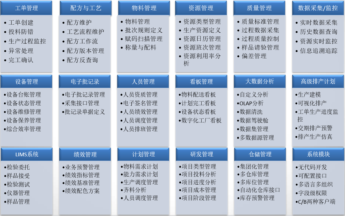 國工智能MES系統(tǒng)主要包括以下模塊,工單管理模塊、研發(fā)管理模塊、物料管理模塊、資源管理模塊、質(zhì)量管理模塊、設(shè)備管理模塊、電子批記錄模塊、看板管理模塊、大數(shù)據(jù)分析模塊、績效管理模塊。
