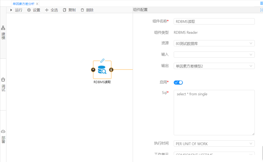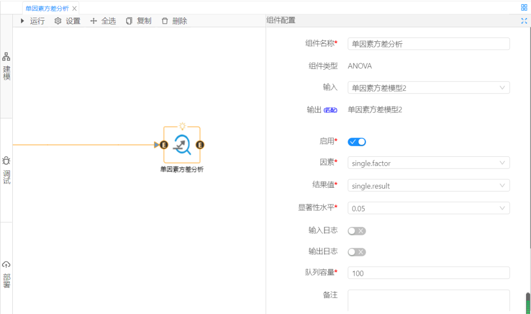 使用集成好算法的單因素方差分析組件進(jìn)行數(shù)據(jù)的單因素分析處理,對(duì)組件參數(shù)進(jìn)行設(shè)置,因素字段配置為factor結(jié)果值配置為檢驗(yàn)結(jié)果result,顯著性水平設(shè)置為0.05,單擊運(yùn)行,從調(diào)試面板中查看分析結(jié)果。