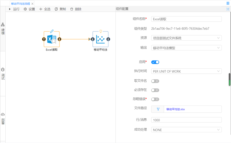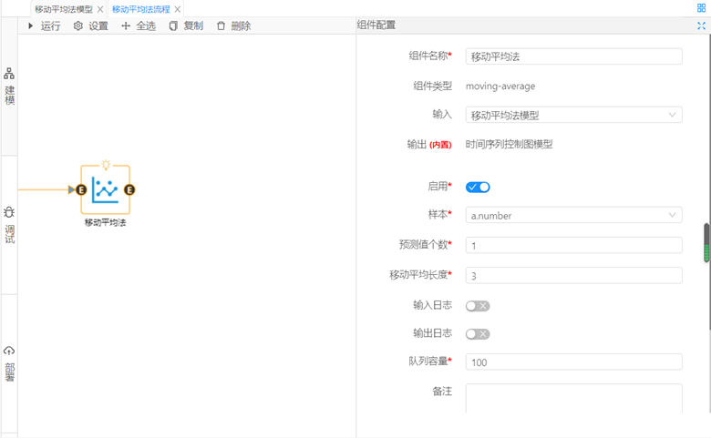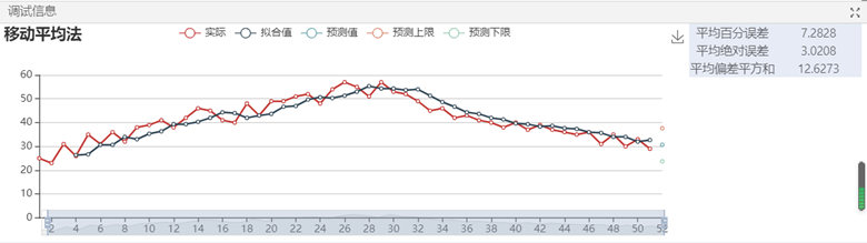 ②使用集成好算法的移動平均法組件對數(shù)據(jù)進行預測,對組件參數(shù)進行設置,樣本設置為number,預測值個數(shù)設置為1,移動平均長度設置為3,單擊運行,從調(diào)試面板中查看分析結果。