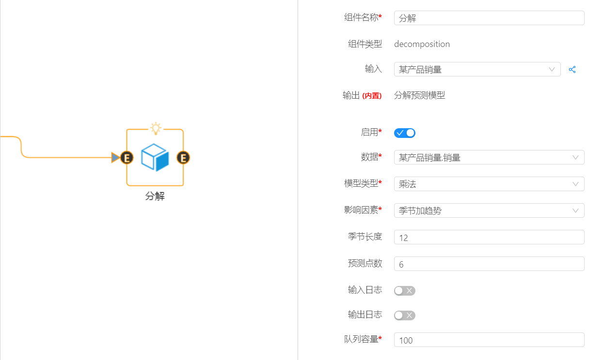 使用系統已集成好算法的分解組件,進行數據的時間序列預測分析處理。對組件參數進行設置,模型類型配置為乘法模型;影響因素配置為季節加趨勢;季節長度配置為12;預測點數配置為6;隊列容量設為100。單擊運行,從調試界面查看運行結果。