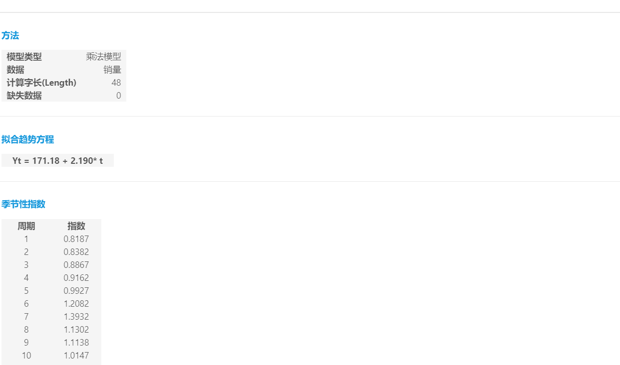 為了能夠反映出季度和總平均值之間的關系,我們采用季節指數作為指標,當季節指數大于1時,說明該季度的值高于總平均值;反之則低于總平均值。當序列的季節指數近似等于1,說明該序列沒有明顯的季節效應。在本次案例中,二者之間的關系較為穩定的,結合圖6左上進行如下分析:6-9月份季節指數是大于1為銷售旺季,其中最高的是7月份是銷售的最高峰。同時參考原始數據序列圖(見圖5左上圖)以及去除趨勢后數據的序列圖(見圖6右上圖和圖5右上圖)也可得出相同的規律。