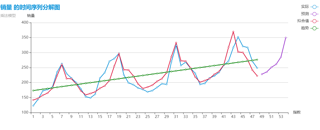 某企業市場部想預測某產品未來幾個月后的銷售量,以便于決策層做出相應并準確的計劃和決策,市場部收集了最近4年的歷史月銷量數據如圖1所示。根據所提供的數據,采用分解算法來預測幾個月的銷售量及其發展趨勢。本案例使用到國工數據大腦中的時間序列預測算法中的分解組件。該組件包含兩個模型:乘法模型和加法模型,本次采用乘法模型進行舉例分析。