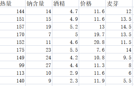 有10種500毫升啤酒的成分和價(jià)格等數(shù)據(jù),試用變量聚類對(duì)變量進(jìn)行聚類以達(dá)到縮減變量的目的,篩選出預(yù)測(cè)變量。數(shù)據(jù)的變量包括熱量、鈉含量、酒精含量、價(jià)格、麥芽濃度。