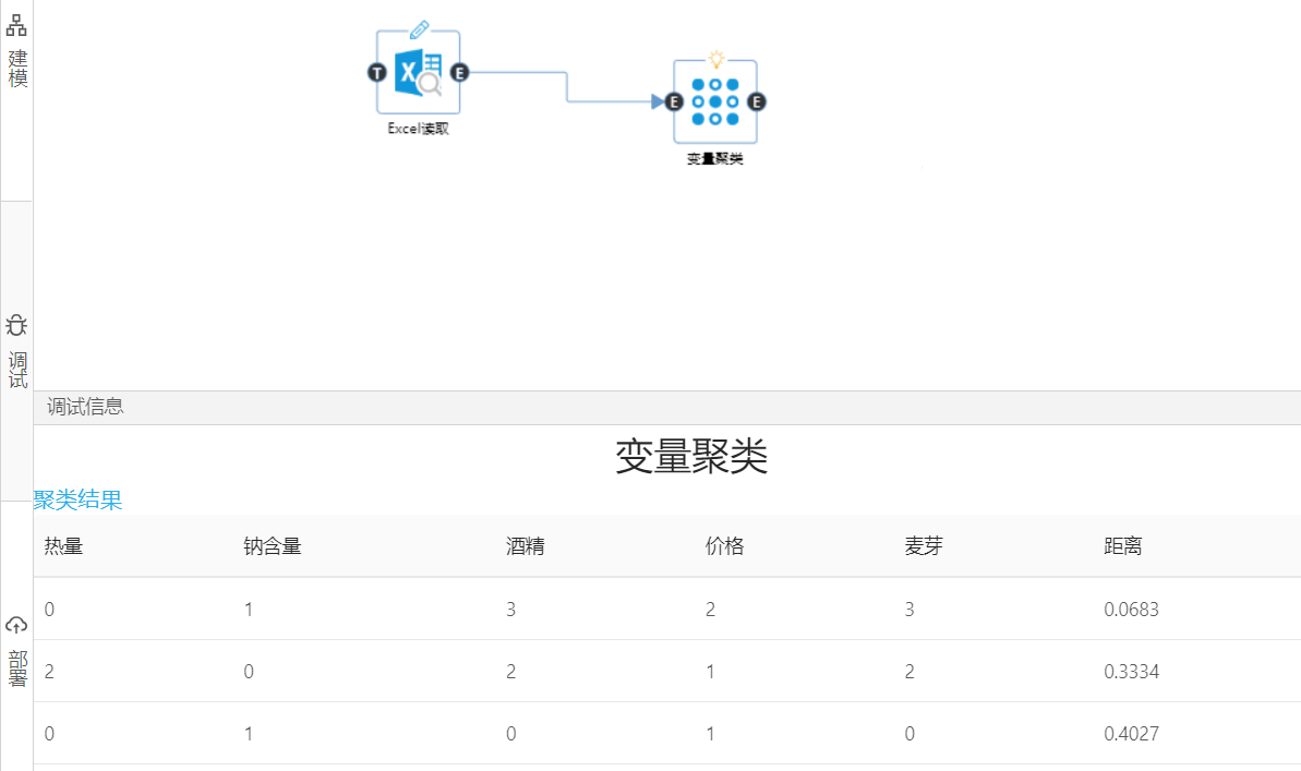 從數(shù)據(jù)大腦中的組件面板查找變量聚類組件,拖到到工作面板,配置數(shù)據(jù)源以及變量聚類組件參數(shù),點(diǎn)擊運(yùn)行。