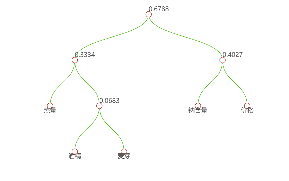 從結(jié)果樹狀圖中可以看出酒精含量與麥芽濃度兩個(gè)變量距離為0.0683,二者之間相關(guān)系數(shù)最大(相關(guān)系數(shù)等于1 - 距離)選其一即可,沒有必要都作為預(yù)測(cè)變量,導(dǎo)致成本增加。至于酒精含量和麥芽濃度選擇哪一個(gè)作為典型指標(biāo)來代替原來的兩個(gè)變量,可以根據(jù)專業(yè)知識(shí)或測(cè)定的難易程度決定。(與因子分析不同,是完全踢掉其中一個(gè)變量以達(dá)到降維的目的。)這里選用酒精含量,至此,確定出用于預(yù)測(cè)的變量為:酒精含量,鈉含量,熱量,價(jià)格。