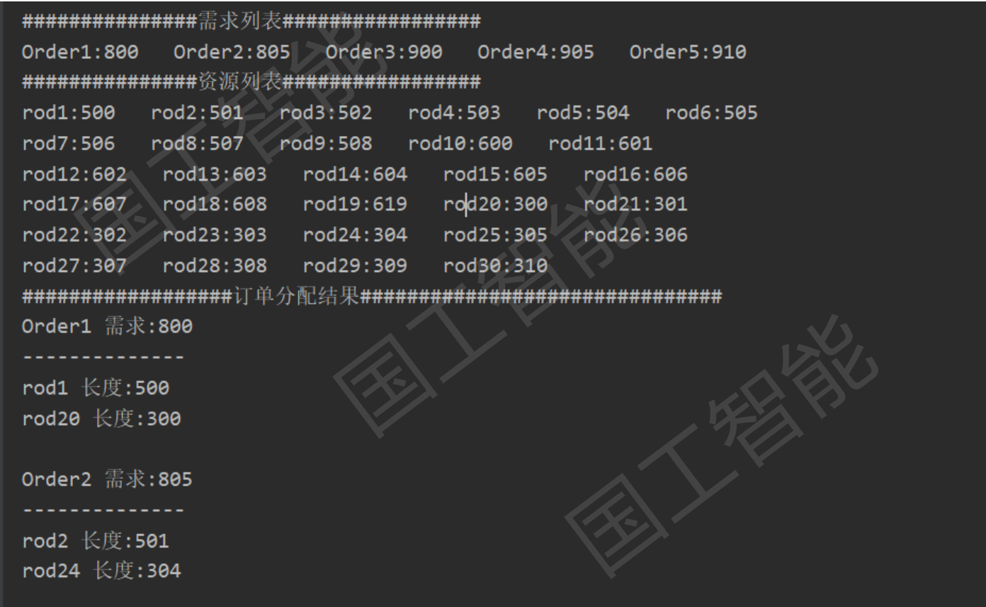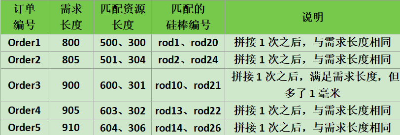 根據(jù)客戶的這個業(yè)務場景和解決思路,公司研發(fā)人員部建立了一個業(yè)務Demo。創(chuàng)建 5個需求,30個硅棒作為現(xiàn)有倉庫存儲,需求的長度必須滿足,可超長,但超長的長度不可超過10,超長部分越少越好,可拼接,但是不能超過3個,拼接的個數(shù)越少越好。(在這里為了演示的可閱讀性,假設硅棒的原料相同,硅棒的截面規(guī)格也相同,只有長度不同,長度單位為毫米,下文在描述時對單位做了省略。)