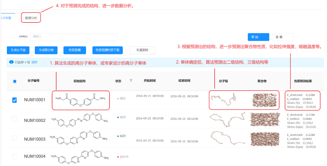 目前,高分子材料在國防航天、電子工業、汽車工業、建筑行業等諸多領域得到了廣泛的應用,已經成為人類生產和生活中重要的一部分。而我們開發的AI輔助研發平臺覆蓋了分子-結構-工藝-性能四個主要模塊,具有較好的普適性。目前該平臺目標以滿足高分子纖維研發為主導同時兼顧橡膠和塑料等高分子材料,在同行業中具備可推廣性。