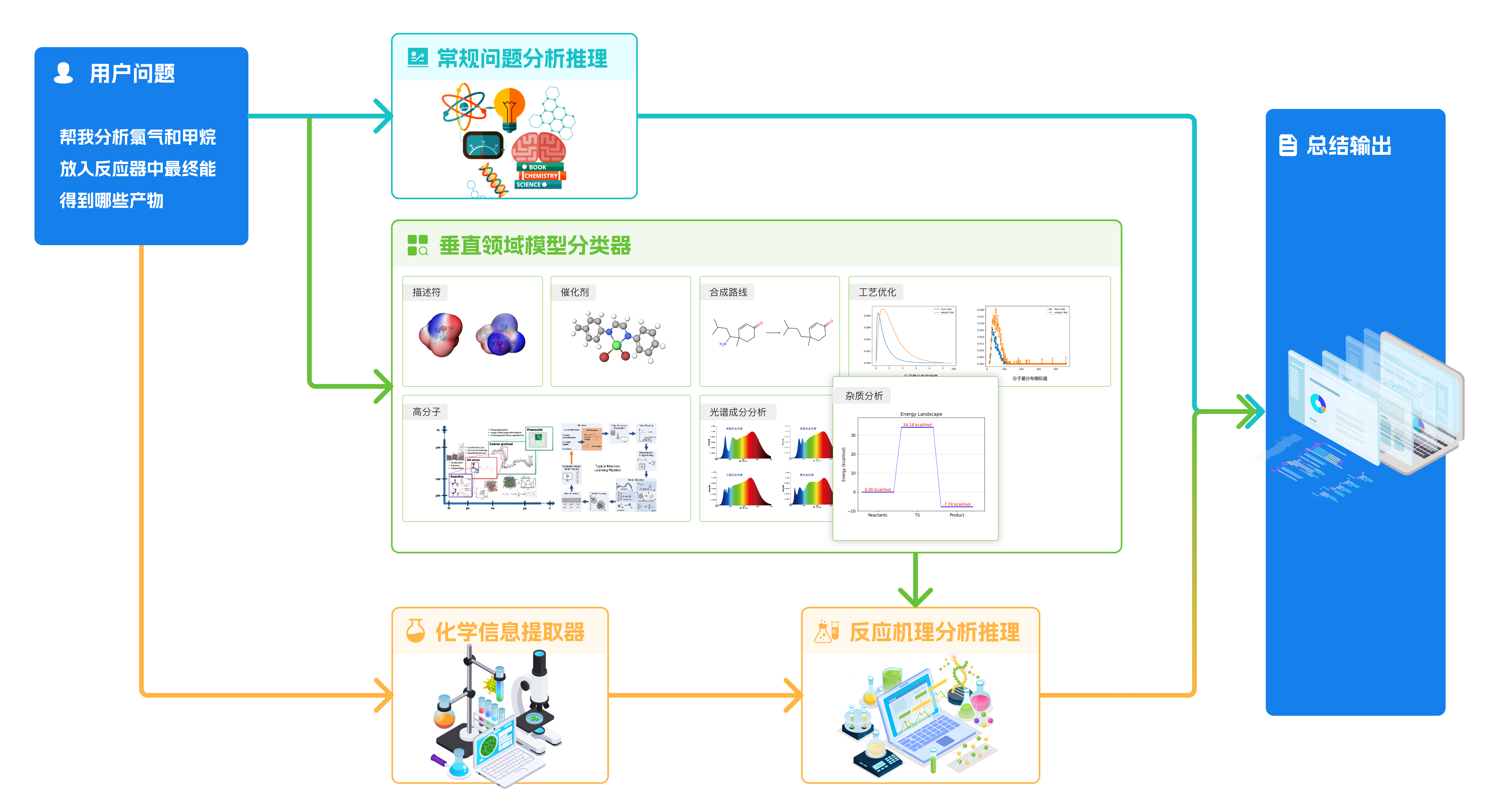 「國(guó)工化工大模型」改變了大模型的“文科生”設(shè)定,朝著“理科生”深度進(jìn)化。大模型技術(shù)與國(guó)工智能AI for Science領(lǐng)域的垂直能力深度融合,針對(duì)具體問(wèn)題進(jìn)行識(shí)別后,聯(lián)動(dòng)調(diào)用「合成推演」、「催化劑設(shè)計(jì)」、「分子動(dòng)力學(xué)及計(jì)算化學(xué)描述符構(gòu)效關(guān)系計(jì)算」、「構(gòu)效關(guān)系計(jì)算」、「產(chǎn)物預(yù)測(cè)」、「量熱預(yù)測(cè)」、「實(shí)驗(yàn)/工藝優(yōu)化」、「高分子配方與性能預(yù)測(cè)」、「譜圖逆分析」等15種垂直領(lǐng)域模型進(jìn)行協(xié)同分析,真正實(shí)現(xiàn)大模型在化工場(chǎng)景的“深度思考”。