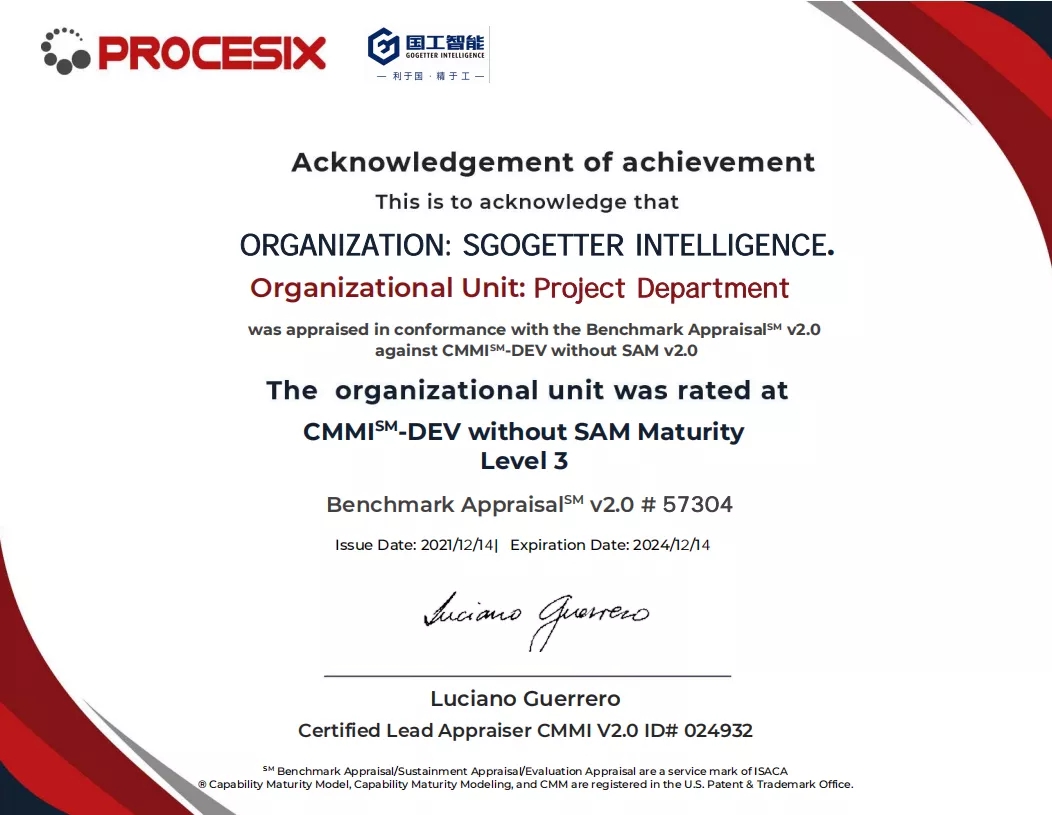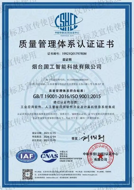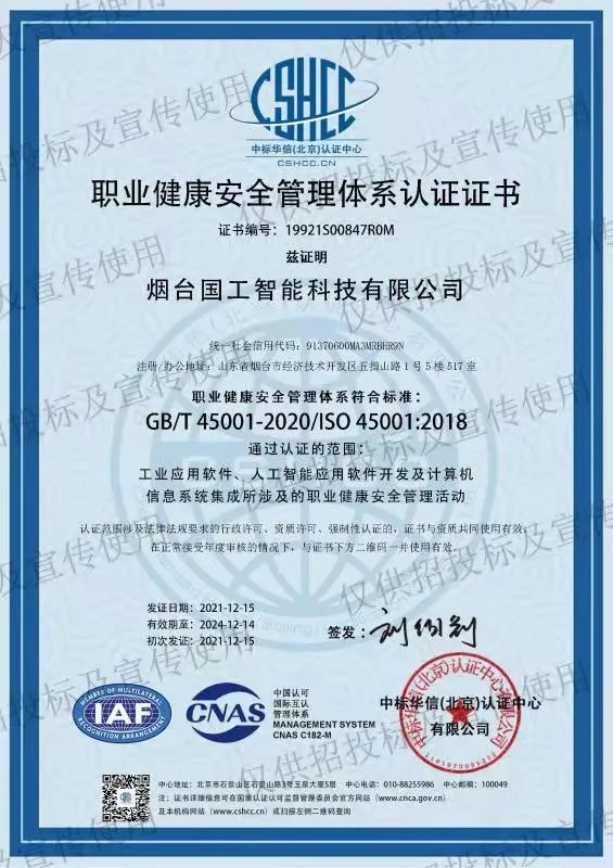 202112月中旬,煙臺國工智能科技有限公司正式獲得ISO 14001環境管理體系認證證書ISO 9001質量管理體系認證證書以及ISO 45001職業健康安全管理體系認證證書。同期獲得了軟件能力成熟度模型集成(CMMI:Capability Maturity Model Integration)三級認證證書。標志著國工智能在智能制造行業的規范化和標準化管理達到新的水平。